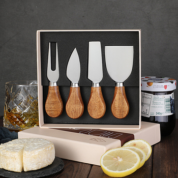 Juego de cuchillos para queso con mango de madera de acacia de 4 piezas con tenedor de acero inoxidable y cuchillo para mantequilla para uso doméstico presentado en caja de regalo